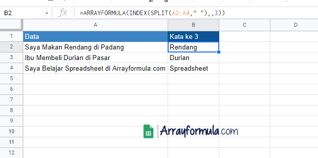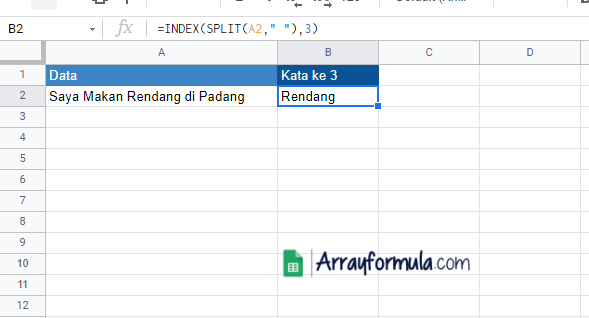 Cara yang paling simple untuk mengambil kata “Rendang” adalah dengan menggunakan gabungan rumus INDEX dan SPLIT. Rumus SPLIT berfungsi memisahkan kata berdasarkan Pemisah karakter tertentu, sedang INDEX digunakan untuk mengindex setiap kata yang sudah dipisah sehingga bisa diambil berdasarkan urutannya.