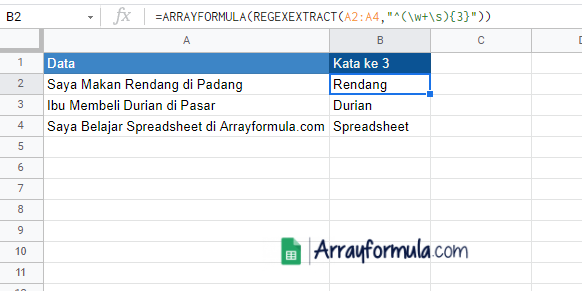 Cara yang paling saya sukai adalah cara ke 3 ini, disini untuk mengambil kata ke 3 menggunakan Regular Expresion atau REGEX. Rumis ini bisa diguanakan Non Array atau bisa juga digabung dengan ARRAYFORMULA.